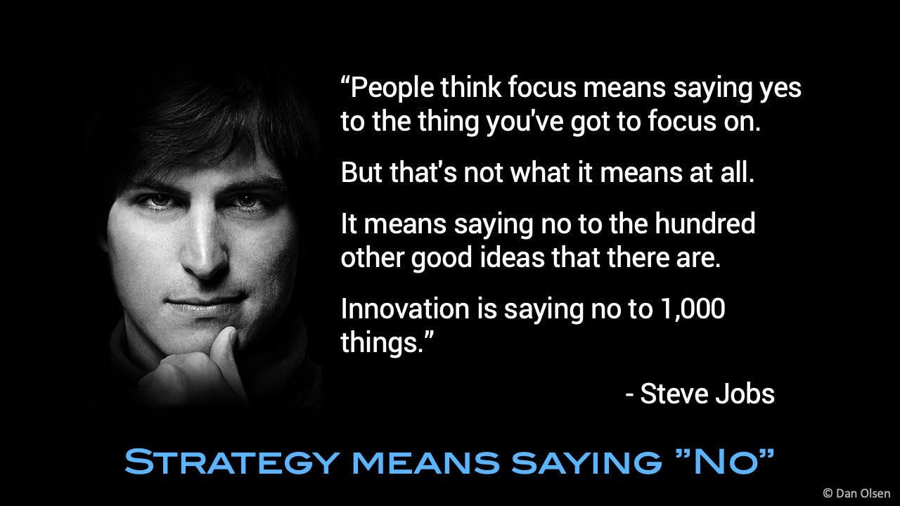 –Steve JobsI like to paraphrase Steve and say “Strategy means saying No.” This is my favorite definition of strategy. If your team is not deliberately saying no to certain options or ideas, then you are not being strategic.